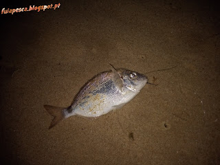 A noite foi passando e fui colhendo alguns sargos já bonzinhos, nada de grandes dentuças, mas pelo menos estava sempre entretido... Ainda estive sempre na esperança de dar com algum robalote já jeitoso mas a única coisa que apareceu ainda foi esta baila! Se pelo menos todas as outras que devolvi fossem deste porte... Uiiiii era um carregamento... lol